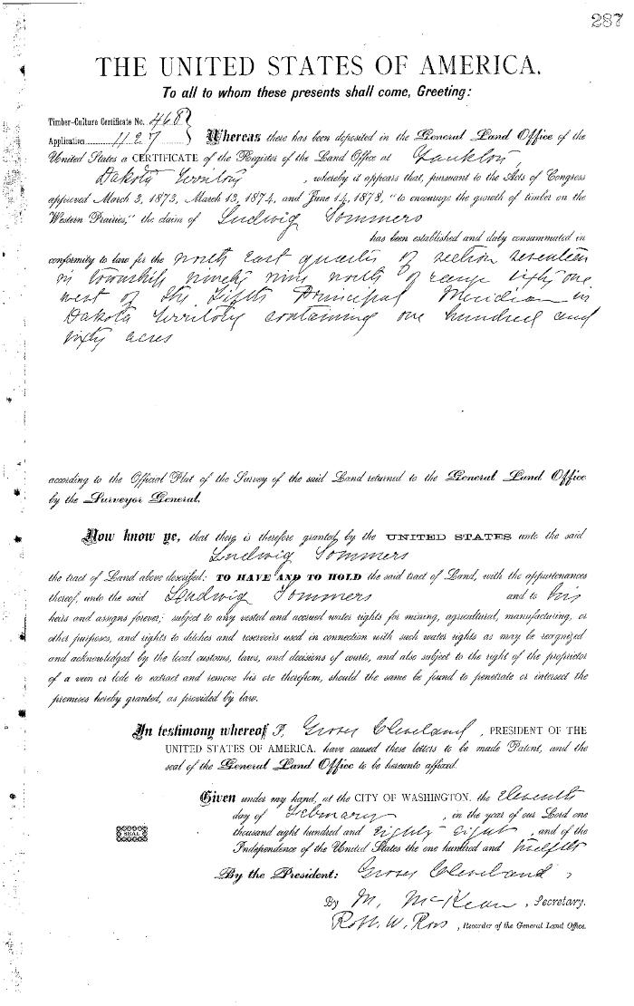 ➔ Ludwig Sommer land record (deed) for South Dakota.
